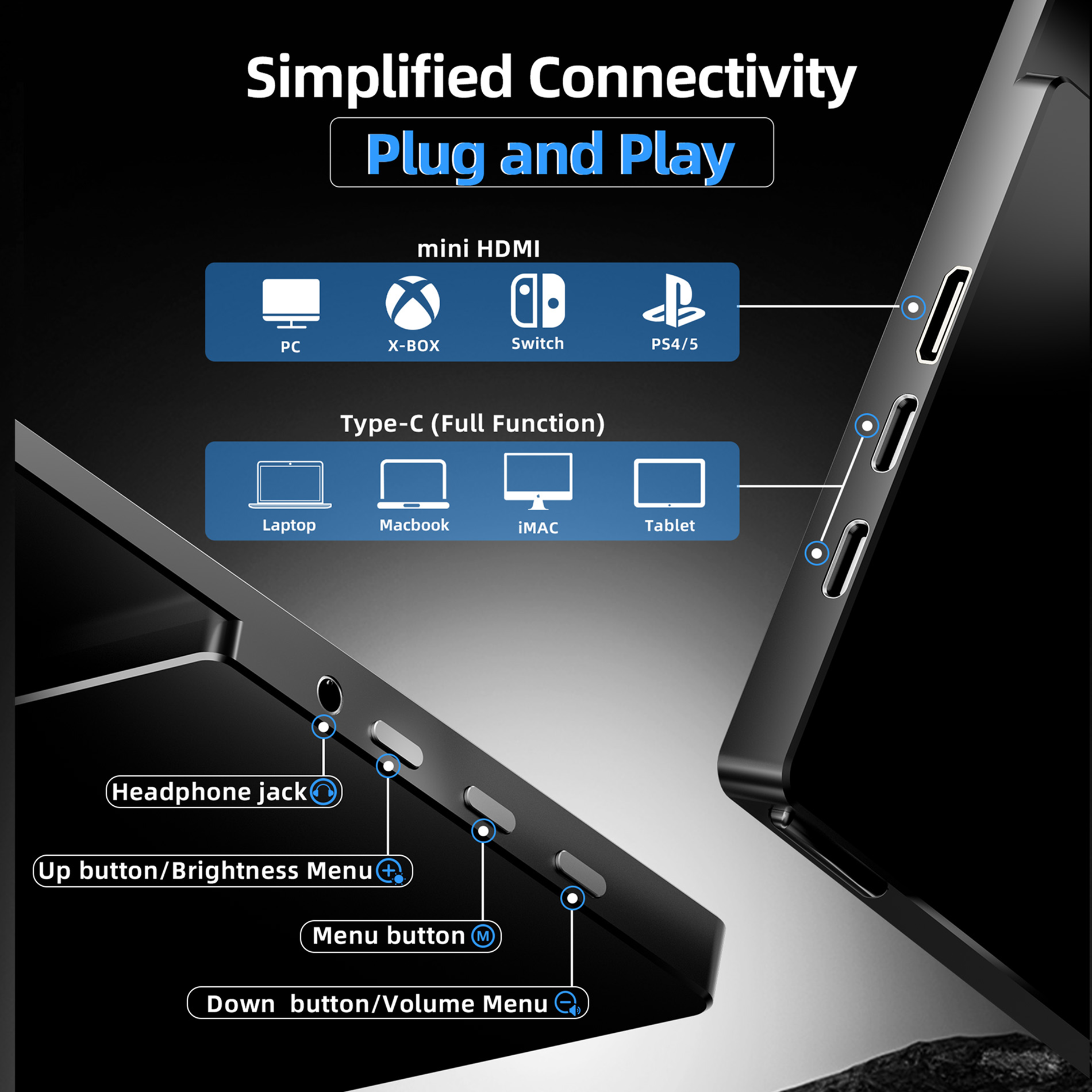 Enjoy smooth gameplay anytime, anywhere. This portable monitor is fully compatible with laptops, mini PCs, desktops, smartphones, and major gaming consoles including Nintendo Switch, Steam Deck, PS4, PS5, and Xbox.